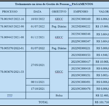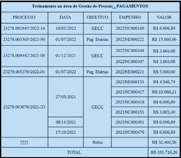 Essa empreitada gerou dispêndios que totalizam R$ 101.716,26 a título de Gratificação por Encargos de Cursos e Concursos (GECC) e diárias, além de bolsas, conforme planilha abaixo: