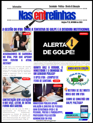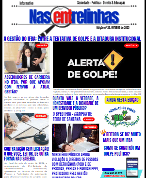 Algumas matérias desta edição: Assediadores de carreira no IFBA. Por que apoiam com fervor a atual gestão? •🤜🏾 A gestão do IFBA: entre a tentativa de golpe e a ditadura institucional •💸 Contratação sem Licitação! O que você, leitor, de outra forma não saberia. •⚖️ Ministério Público apura violação a direitos de pessoas Com Deficiência (PCD) e de Pessoas, Pretas e Pardas (PPP), praticados pela Gestão Humanizada do IFBA. •🚷 Quanto vale a verdade, a honestidade e a dignidade de um servidor público? •🔏 O BPEq IFBA - Campus de Feira de Santana. •🙋🏾 A Reitora se diz muito mais que um IFBA •💂🏾 Como se constrói um golpe político?