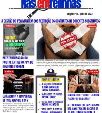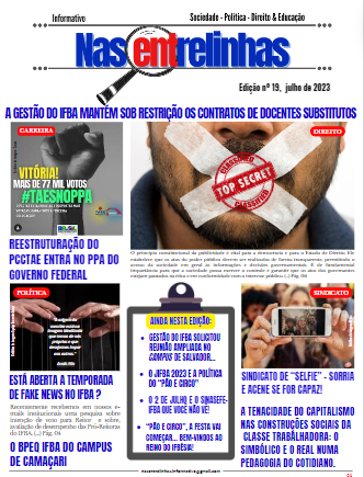 Algumas matérias presentes nesta edição: A gestão do IFBA mantém sob restrição os contratos de docentes substitutos; Reestruturação do PCCTAE entra no PPA do Governo Federal; Está aberta a temporada de fake news no IFBA?; Gestão do IFBA solicitou reunião ampliada no Campus Salvador; O 2 de Julho e o SINASEFE-IFBA que você não vê!; A tenacidade do capitalismo nas construções sociais da classe trabalhadora: o simbólico e o real numa pedagogia do cotidiano; Sindicato de "selfie" - sorria e acene se for capaz!